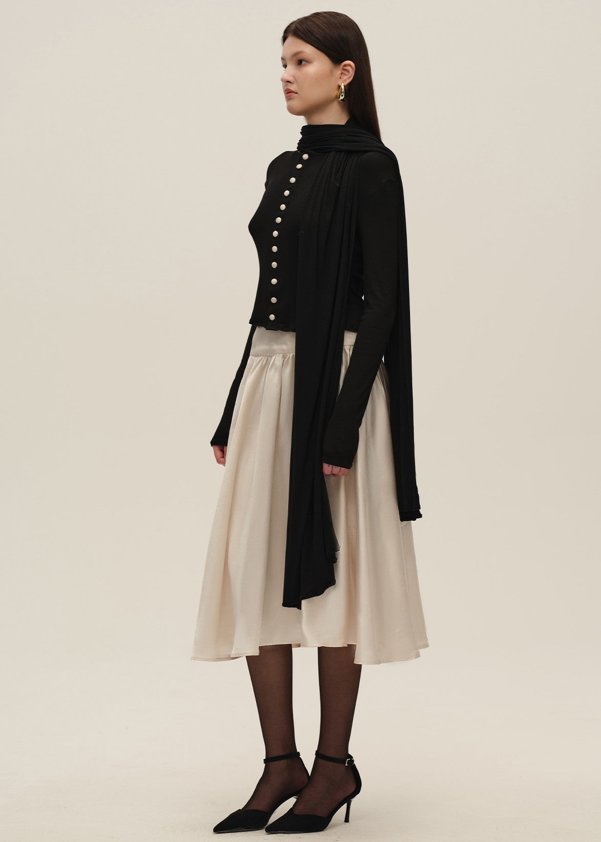 Black Cardigan with Decorative Scarf Detail